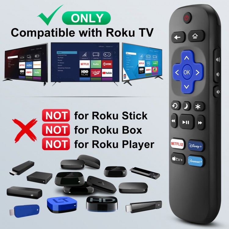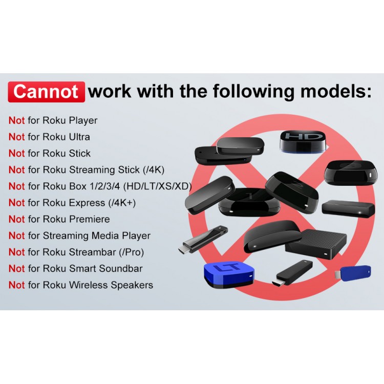- 【NOT APPLICABLE】❌It does not work with other Roku devices. The TV remote is not compatible with Roku Stick, not for Roku Streaming Stick, not for Roku Box 1/2/3/4 (HD/LT/XS/XD), not for Roku Ultra, not for Roku Express, not for Roku Premiere or not for Roku Player