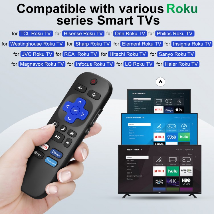 - 【COMPATIBLE WITH】✅The Tuovar replacement remote is universal for all major brands of Roku TV series smart TVs. Only compatible with Roku series smart TVs, including for TCL Roku TVs, for Hisense Roku TVs, for Onn Roku TVs, for Philips Roku TVs, for Westinghouse Roku TVs, for Sharp Roku TVs, for Element Roku TVs, for Insignia Roku TVs, for JVC Roku TVs, for RCA Roku TVs, for Hitachi Roku TVs, for Sanyo Roku TVs, for Magnavox Roku TVs, for Infocus Roku TVs, for LG Roku TVs