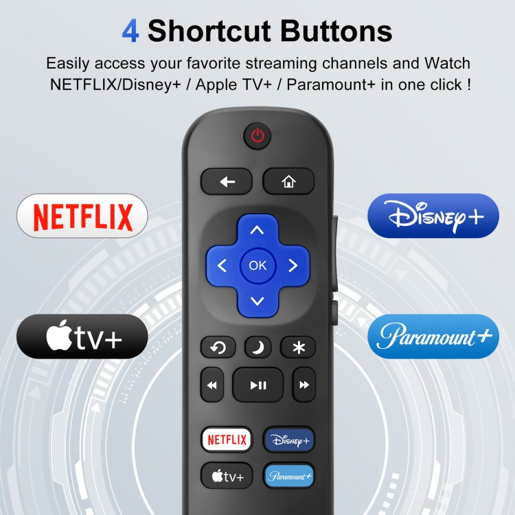 - 【CONVENIENT OPERATION】①No need to pair or set up, just put in the batteries and start using the remote.②4 shortcut buttons(NETFLIX, Disney+, Apple TV+ and Paramount+) for quick access to popular streaming channels. 【NOTE】⚠️No pairing button. ⚠️No voice function. ⚠️No headphone jack