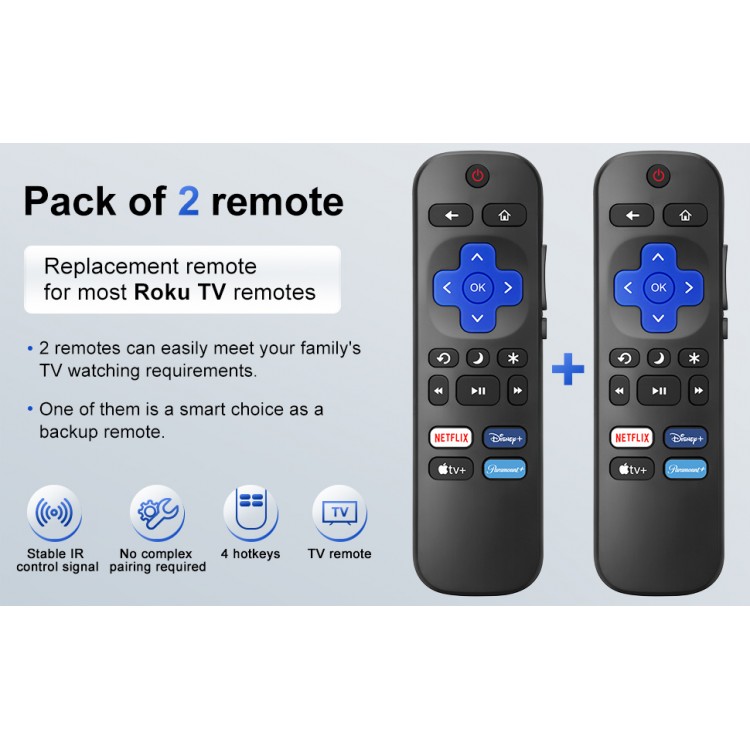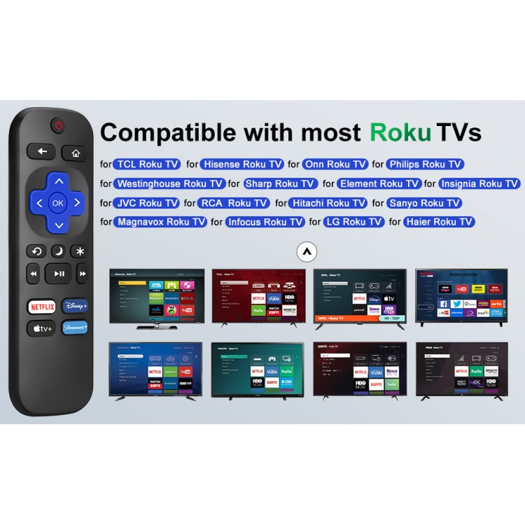 Pack of 2 Replacement remotes for Roku TV . Two remotes to solve your home backup remote control needs. ONLY compatible with major manufacturers' Roko TVs: for TCL Roku TV, for Hisense Roku TV, for Onn Roku TV, for Philips Roku TV, for Westinghouse Roku TV, for Sharp Roku TV, for Element Roku TV, for Insignia Roku TV, for JVC Roku TV, for RCA Roku TV, for Hitachi Roku TV, for Sanyo Roku TV, for Magnavox Roku TV, for Infocus Roku TV, for LG Roku TV